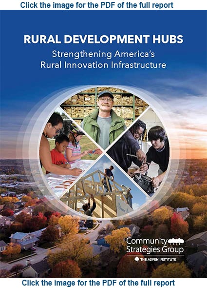 Released on November 12, 2019, the Aspen Institute’s report “Rural Development Hubs: Strengthening America’s Rural Innovation Infrastructure” summarizes findings and recommendations from interviews with 43 Rural Development Hubs from across the nation who are intermediaries leading the effort to do rural development differently. According to the report, “Intermediaries are place-based organizations that work to improve prosperity and well-being by harnessing local and outside resources to design and deliver services and products to people, firms and organizations in their region.” Read the full report by clicking the image below.